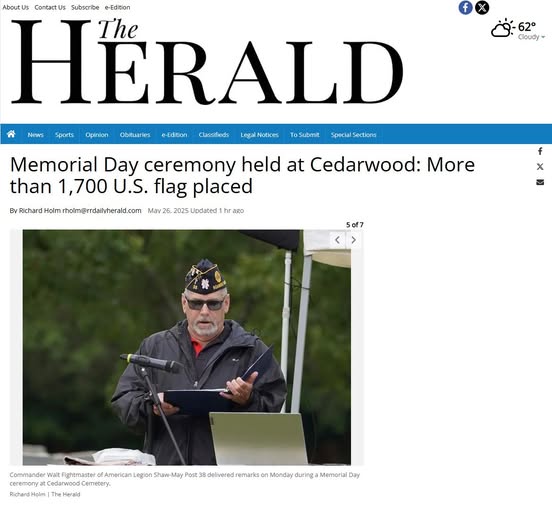 Commander Walt Fightmaster of American Legion Shaw-May Post 38 delivered remarks on Monday during a Memorial Day ceremony at Cedarwood Cemetery.
